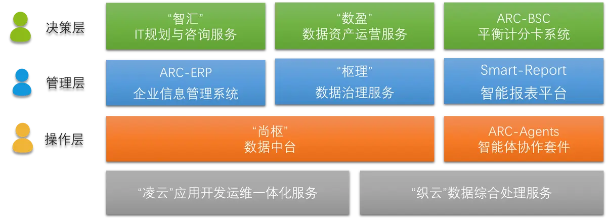 在決策層,“智匯”IT規(guī)劃與咨詢服務,憑借專業(yè)團隊對行業(yè)趨勢和技術生態(tài)的深度洞察,為企業(yè)量身定制契合發(fā)展戰(zhàn)略的IT架構藍圖,明晰數字化路徑;“數盈”數據資產運營服務,挖掘企業(yè)數據價值,將分散數據轉化為可運營、能創(chuàng)造效益的資產,驅動業(yè)務創(chuàng)新;ARC - BSC平衡計分卡系統(tǒng),以戰(zhàn)略為導向,從財務、客戶、內部流程、學習與成長等維度,量化指標、監(jiān)控進度,助力科學決策 。