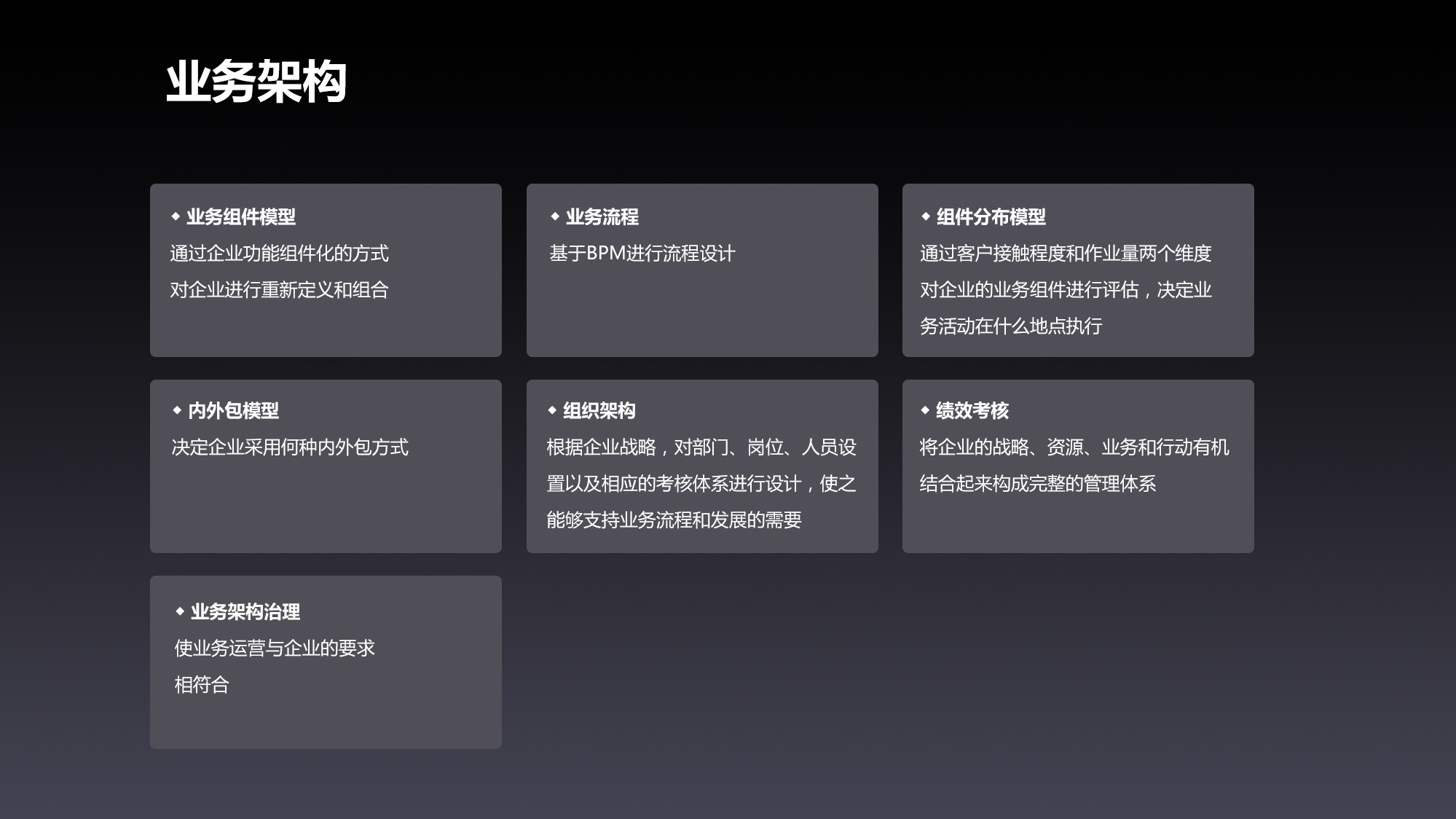 基于BPM設(shè)計(jì)業(yè)務(wù)流程,結(jié)合管理層ARC - ERP系統(tǒng)與“樞理”數(shù)據(jù)治理,梳理、優(yōu)化流程,消除冗余環(huán)節(jié),提升運(yùn)轉(zhuǎn)效率;借組件分布模型,從客戶接觸程度和作業(yè)量維度,評(píng)估業(yè)務(wù)組件,合理規(guī)劃業(yè)務(wù)活動(dòng)執(zhí)行地點(diǎn),降低運(yùn)營(yíng)成本;以內(nèi)外包模型,科學(xué)決策業(yè)務(wù)外包方式,聚焦核心競(jìng)爭(zhēng)力;依據(jù)戰(zhàn)略設(shè)計(jì)組織架構(gòu),適配部門(mén)、崗位、人員及考核體系,為業(yè)務(wù)流程筑牢組織支撐;通過(guò)績(jī)效考核,串聯(lián)戰(zhàn)略、資源、業(yè)務(wù)與行動(dòng),構(gòu)建完整管理體系;依托業(yè)務(wù)架構(gòu)治理,確保業(yè)務(wù)運(yùn)營(yíng)貼合企業(yè)要求,讓?xiě)?zhàn)略落地“看得見(jiàn)、摸得著”。